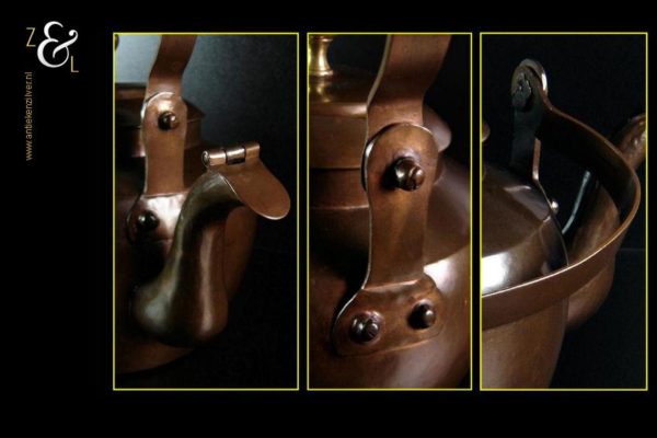 Deze Hollandse appelketel stamt uit de eerste helft van de negentiende eeuw. De ketel is gemaakt van koper heeft een messing knop en is van binnen vertind. De bodem en zijkant hebben een zwaluwstaart verbinding en het hengsel is met nagels vastgezet. De ketel heeft zijn nog oorspronkelijke donkerbruine patina weegt 1637 gram meet met het hengsel omhoog 30 cm, is 30.5 cm lang en 21 cm breed. De ketel heeft een klein deukje (is zichtbaar op de derde foto).