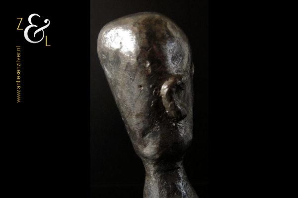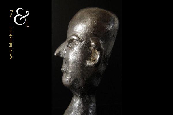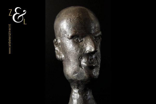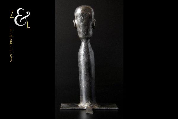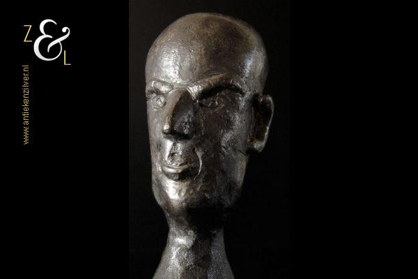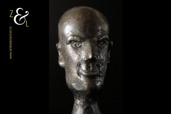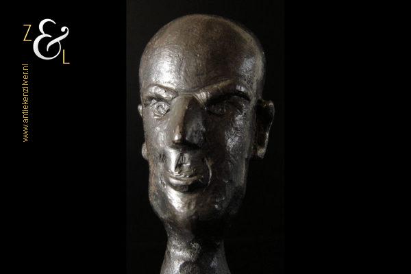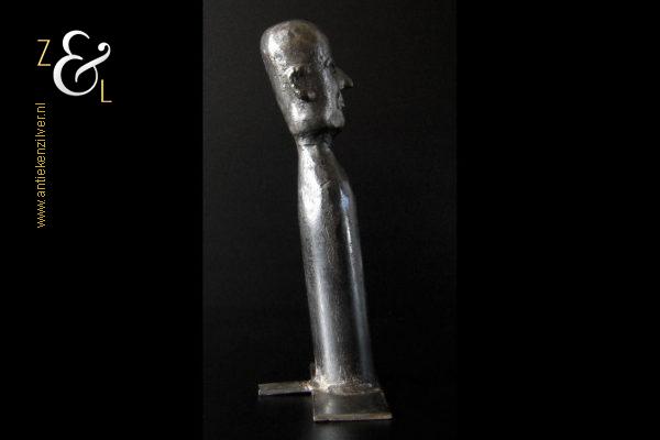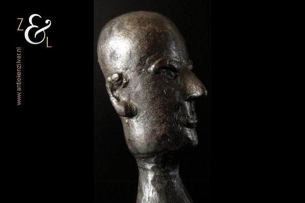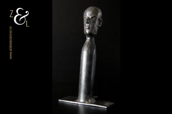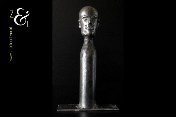 Dit handgesmede beeld / plastiek van een mannenhoofd is gemaakt door een voor ons nog onbekende kunstenaar / smid. Het zwart grijs gepatineerde ijzeren beeld / plastiek is gesmeed uit een stuk ijzeren buis dat gelast zit op een paar ijzeren rechthoeken die als voet dienst doen. Het beeld / plastiek weegt 561 gram is 20.8 cm hoog en de voet is 11.9 cm lang bij 6.8 cm breed.