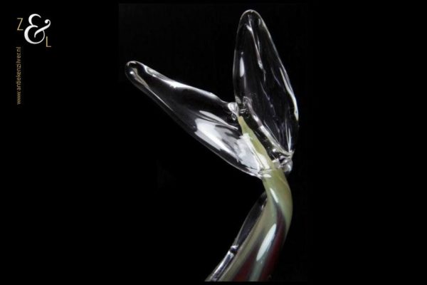 Deze grote glazen vis stamt uit Frankrijk waar hij in de 20e eeuw mondgeblazen en handgevormd is. De vis is uitgevoerd in groen, wit en bruinrood glas en heeft in transparant glas uitgevoerde staart en vinnen. De vis die aan de onderzijde gesigneerd is met Nova’r F heeft een lengte van 47 cm is 10 cm breed en 16.5 cm hoog hij weegt 1180 gram.