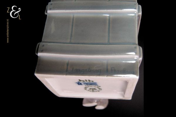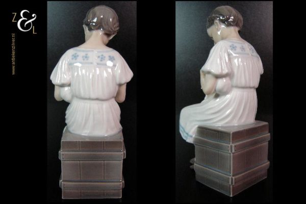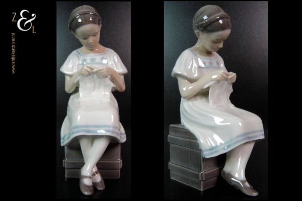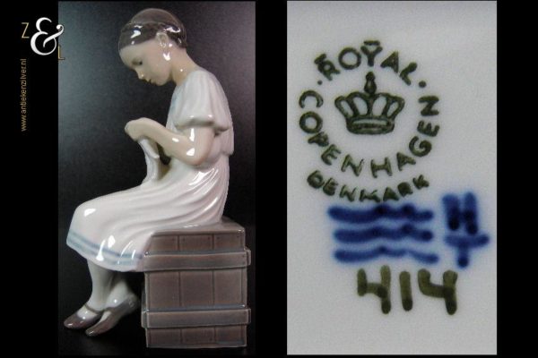 Dit porseleinen beeld / plastiek model “Grethe” (van een Breiend meisje zittend op een kist) is gemaakt bij Royal Copenhagen te Denemarken. Aan de onderzijde is het beeld / plastiek in groen gemerkt met het modelnummer 414 en het merk Royal Copenhagen Denmark met een streepje boven de R en Y van Royal dat staat voor het jaar van productie dat tussen 1992 en 1999 ligt. Tevens is het beeld / plastiek in blauw gesigneerd met HT dit is de schilder* die het beeld / plastiek gedecoreerd heeft en het drie golven merk die symbool staan voor de Sont, de Grote Belt en de Kleine Belt de zeestraten die tussen de Deense eilanden lopen. Aan de achterzijde van het beeld / plastiek aan de onderkant van de kist staat de naam van de ontwerper Ingeborg Plockross*. Het beeld / plastiek weegt 348 gram is 9.5 cm lang 7.2 cm breed en 17.3 cm hoog.