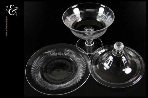 Deze Hollandse kristallen bonbonnière / drageoir / gembercoupe met schotel stamt uit de 1e helft van de 20e eeuw (rond 1920) de Art Deco periode. De bonbonnière / drageoir / gembercoupe is mondgeblazen, gepolijst en handgeslepen in een verticaal en horizontaal patroon en heeft een gefacetteerde balustervormige stam. De bonbonnière / drageoir / gembercoupe weegt 980 gram en heeft een hoogte 21 cm en een diameter van 19 cm.