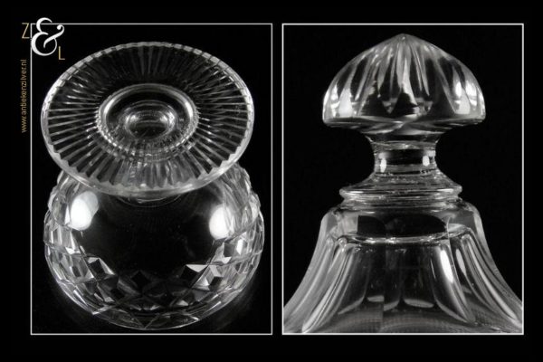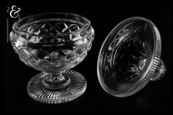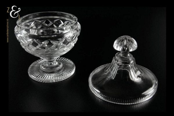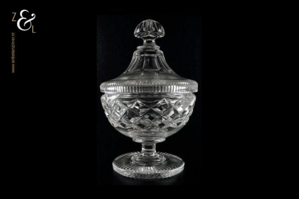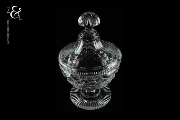 Deze kleine ruitgeslepen kristallen Hollandse bonbonnière / drageoir / gembercoupe stamt uit de 2e helft van de 19e eeuw. De mondgeblazen, handgeslepen en gepolijste bonbonnière / drageoir / gembercoupe weegt 491 gram en heeft een diameter van 10 cm en een hoogte van 16 cm.