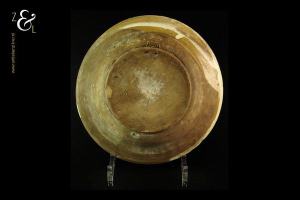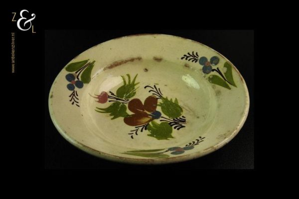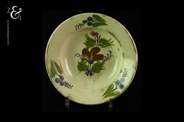 Dit met bloemen in een veelkleurig glazuur op de hand beschilderde aardewerk bord (Mouzin Lecat & Cie België?) stamt uit de 19e eeuw. De achterzijde van het niet gemerkte bord is ongeglazuurd en heeft twee gaatjes waar een ijzerdraadje doorheen past zodat men het bordje kan ophangen. Het bord heeft een diameter van 21 cm en is 4.7 cm hoog. Het bord vertoont slijtageplekken en wordt verkocht exclusief bordenstandaard.