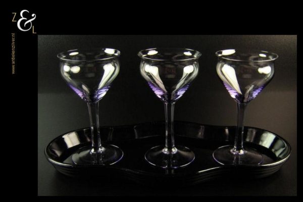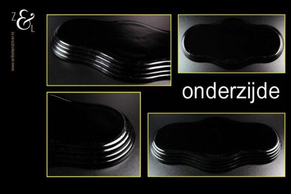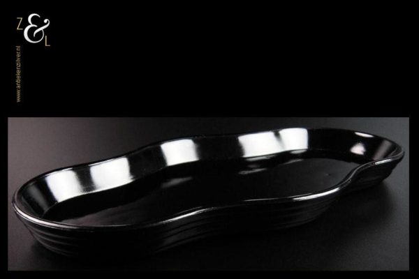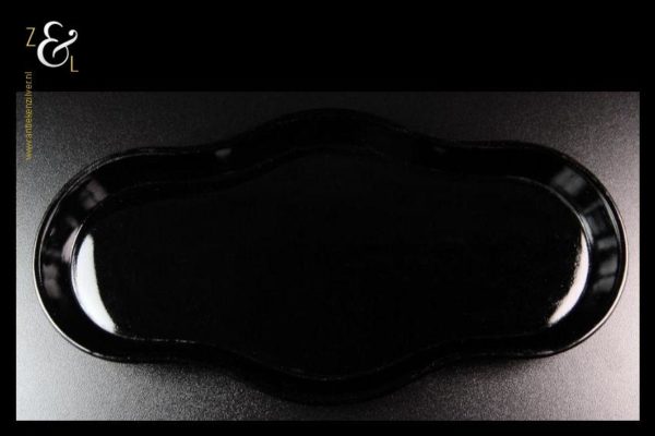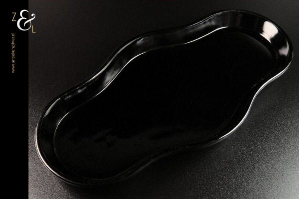 Dit zwart persglazen dienblad is in 1935 gemaakt bij de N.V. Nederlandse Glasfabriek Leerdam en is terug te vinden in de prijslijst van 1935 Sonoor Glaswerk op bladzijde 13 onder borden GL. 637 Bord, zwart. Het geribde dienblaadje werd toen gebruikt als onderblad voor een roomstel. Het dienblad meet 30.5 cm lang 15.5 breed en is 2.5 cm hoog, het weegt 757 gram.