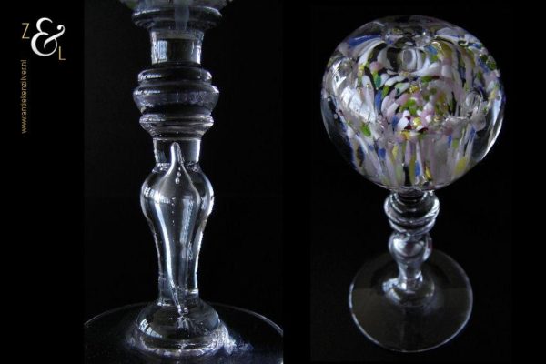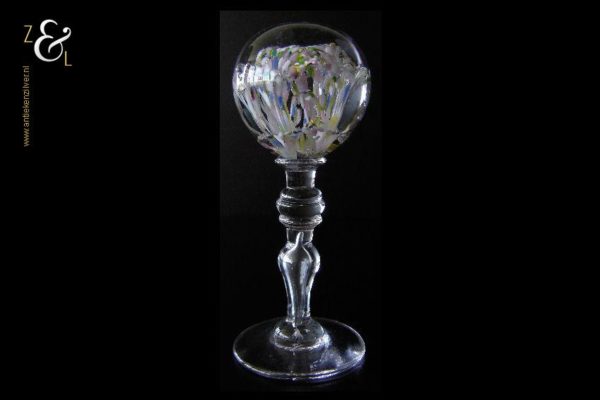 Deze pruikenstandaard is gemaakt in België of Frankrijk en stamt uit de 19e eeuw. De helderglazen pruikenstandaard heeft een balustervormige steel met luchtbel en de bol heeft veelkleurige bloemkelken met ingestoken luchtbellen. De pruikenstandaard weegt 901 gram en is 20.5 cm hoog. De bol heeft een diameter van 7.8 cm en de voet heeft een diameter van 8.5 cm. De zijkant van de bol en de rand van de voet hebben een klein ruw plekje, hier heeft de pruikenstandaard tijdens het afkoelen in de koeloven op gelegen.