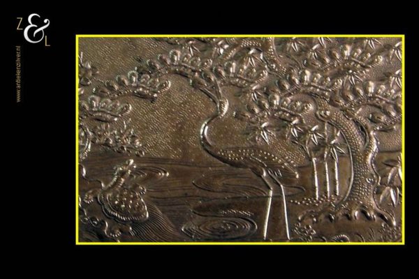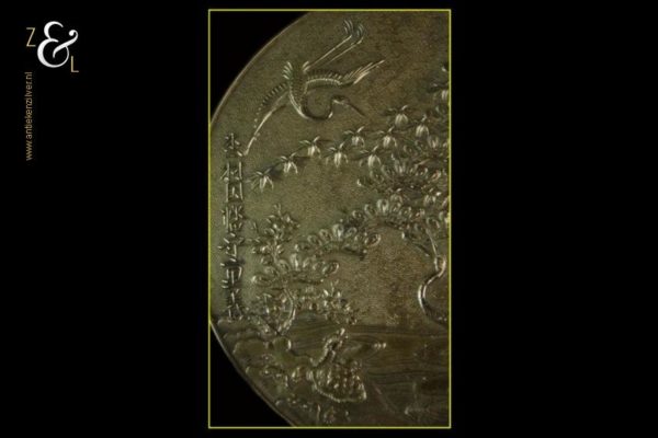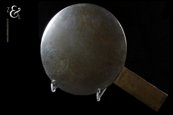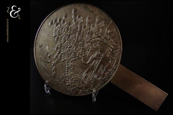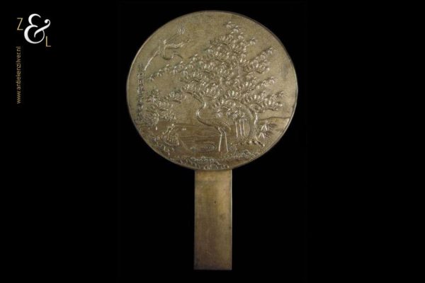 Antieke Japanse bronzen handspiegel (in het Japans kagami) met een gedetailleerde decoratie van een schildpad, kraanvogels, pijnbomen, bamboe en stromend water. De inscriptie aan de linkerkant van deze handspiegel hebben wij nog niet kunnen ontcijferen. De lengte van deze spiegel meet inclusief handvat 28 cm de spiegel heeft een diameter van 18.2 cm en hij weegt 711 gram. De ronde handspiegels stammen uit de Edo periode die liep van 1615 tot 1868. Deze handspiegel stamt ongeveer uit het begin van de 19e eeuw. De handspiegels werden vaak gebruikt als huwelijksgeschenken. Deze spiegel heeft aan de voorkant nog sporen van verguldsel. Aan de achterkant is de handspiegel voorzien van een laagje tin dat net zolang gepolijst werd totdat men een mooi reflecterend (spiegelend) oppervlak kreeg. Zelfs nu kan je nog de reflectie van je gezicht zien in deze spiegel die toch zo’n tweehonderd jaar oud is. Japanse bronzen spiegels hebben een geschiedenis van bijna twee duizend jaar, te beginnen in de Yayoi periode (300 v.Chr. tot 250 A.D.).
