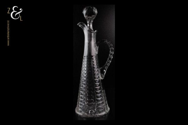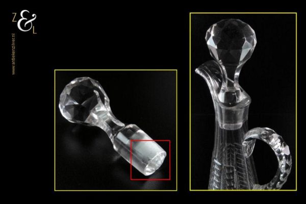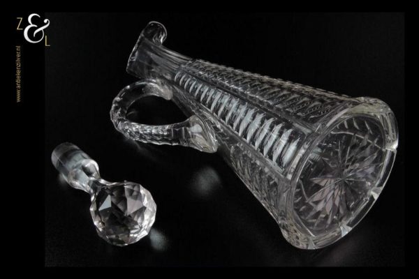 Deze Hollandse kristallen karaf met oor stamt uit het einde van de 19e eeuw is mondgeblazen en op de hand geslepen met olijven en een ster aan de onderzijde. De karaf weegt 900 gram heeft een diameter van 11 cm en is 33.5 cm hoog. Aan de onderzijde van de stop zitten een paar kleine chipjes zie foto.