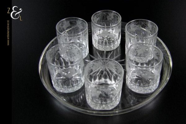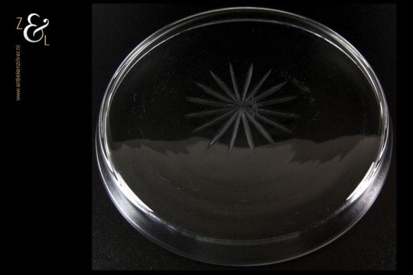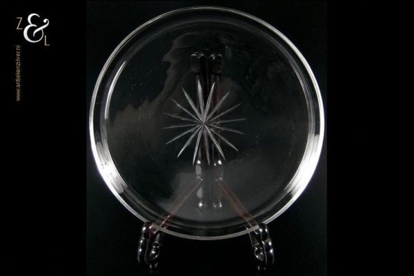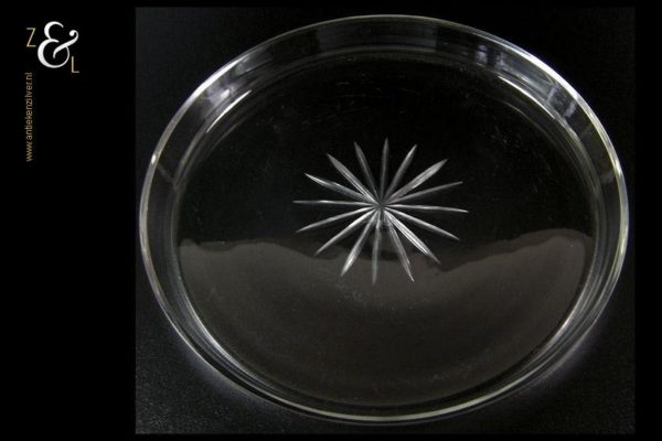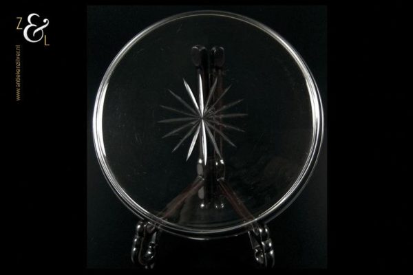 Dit mooie mondgeblazen kristallen dienblad stamt uit de19e eeuw en heeft aan de onderzijde een fraai op de hand geslepen ster. Het dienblad weegt 415 gram en heeft een diameter van 23 cm, de rand is 2.2 cm hoog. Aan de onderzijde van het blad zitten wat krasjes (gebruikssporen) wat inherent is aan dit soort antieke stukken. De afgebeelde glazen dienen ter decoratie.