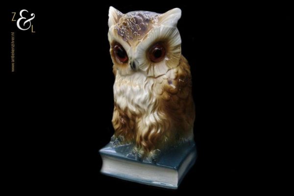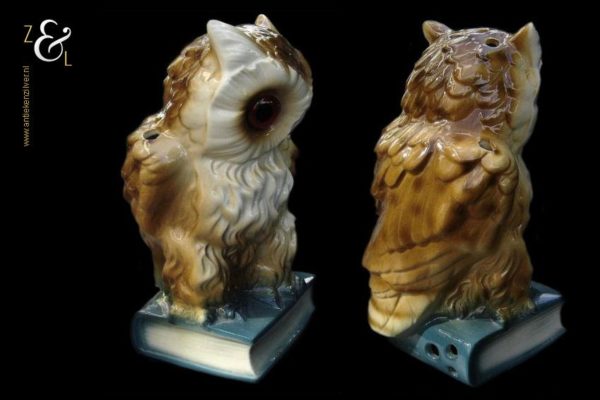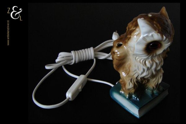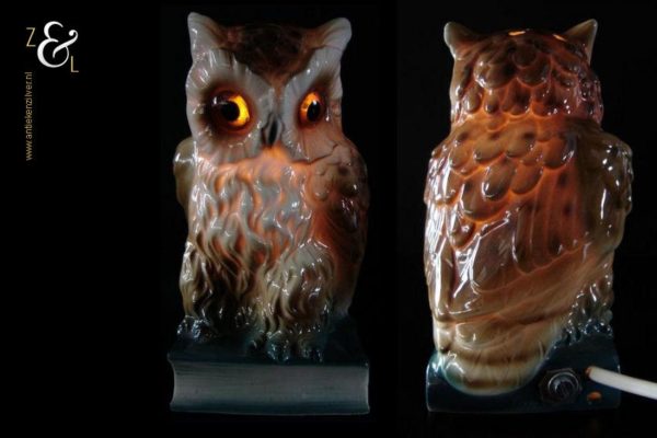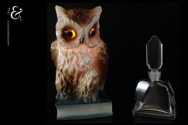 Dit porseleinen parfumlampje* in de vorm van een uil zittend op een boek (symbool van de wijsheid) is vermoedelijk geproduceerd in Duitsland en stamt uit de eerste helft van de 20e eeuw, de dertiger jaren. Het beeldje dat is gemerkt met het modelnummer 8625 is 15.5 cm hoog en weegt 305 gram. Het parfumlampje is klaar voor gebruik, het reservoir voor de geparfumeerde olie is heel, (bij veel parfumlampjes is door verkeerd gebruik het reservoir gebarsten dit kwam doordat men het lampje bijvulde terwijl het nog heet was, door het hoge temperatuurverschil barstte daarom het reservoir) en uit veiligheidsoverweging is het elektrische gedeelte nagekeken en het oude snoer en lampje vervangen door een nieuw lampje en een twee meter lang snoer met schakelaar.