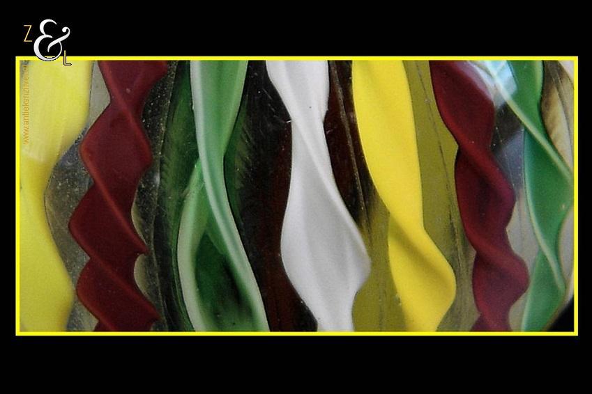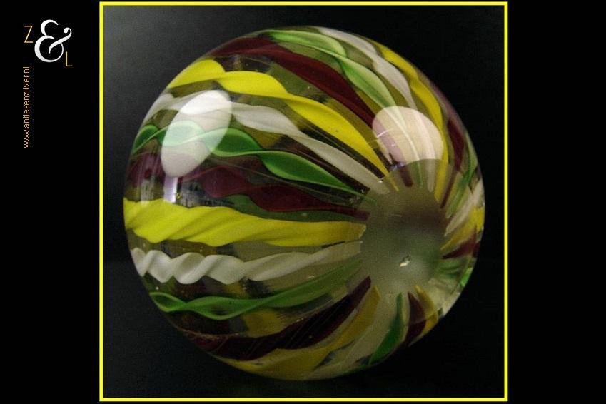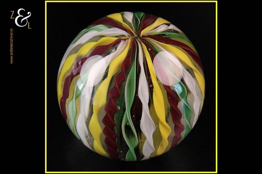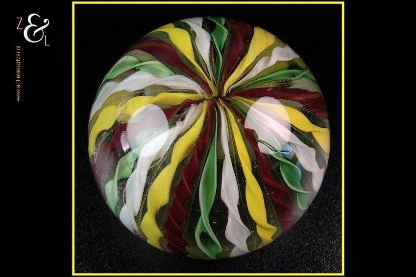 Deze helder glazen presse papier met groen rood geel witte getordeerde strepen is in de 20e eeuw gemaakt in Murano hij weegt 631 gram en heeft een diameter van 7.8 cm.