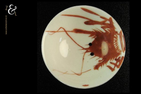 Dit Japanse met een garnaal gedecoreerde porseleinen sake kommetje stamt uit het eind van de 19e begin 20e eeuw, de zogenaamde Meiji periode die liep van 1868 tot 1912. Het kommetje is 2.7 cm hoog heeft een diameter van 7.1 cm en weegt 31 gram. Het leuke bij dit op de hand beschilderde kommetje is alsof de garnaal over de rand van het kommetje klimt.