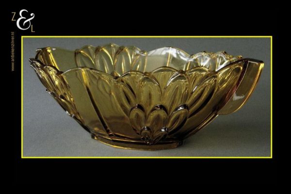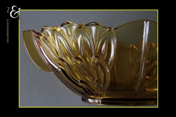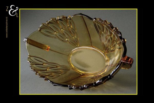Deze persglazen amberkleurige Art Deco schaal met gestileerd bladmotief is rond 1930 gemaakt in Tsjecho-Slowakije (de onderzijde is gesigneerd met het geëtste Czecho Slovakia). De schaal heeft een lengte van 28 cm is 15.5 cm breed en heeft een hoogte van 8.8 cm hij weegt 662 gram.