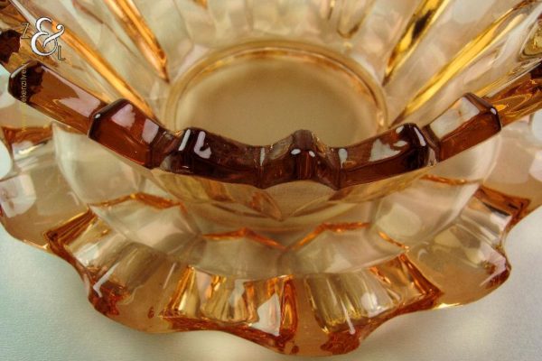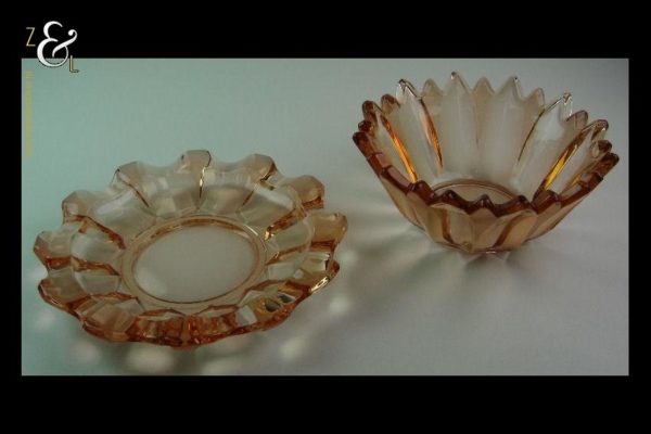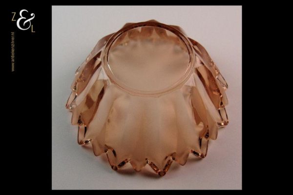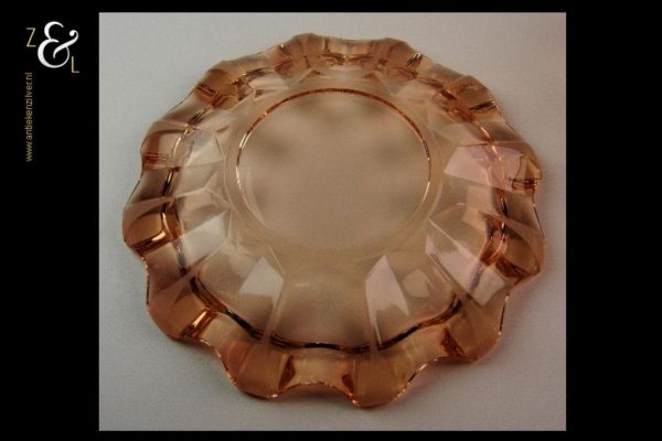 Deze in rosé kleur uitgevoerde persglazen Art Deco schaal met schotel is omstreeks 1900 gemaakt bij de kristal- en glasfabriek Val Saint Lambert. De apart gevormde schaal en schotel zijn gedeeltelijk geëtst. Schaal en schotel zijn op elkaar staand 8 cm hoog. De schaal heeft een diameter van 16 cm en de schotel heeft een diameter van 18.6 cm samen wegen zij 954 gram.