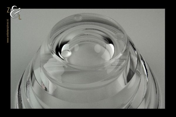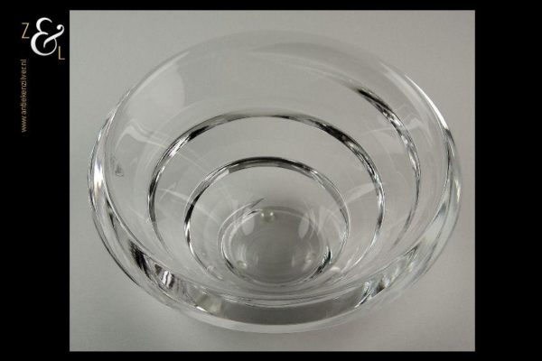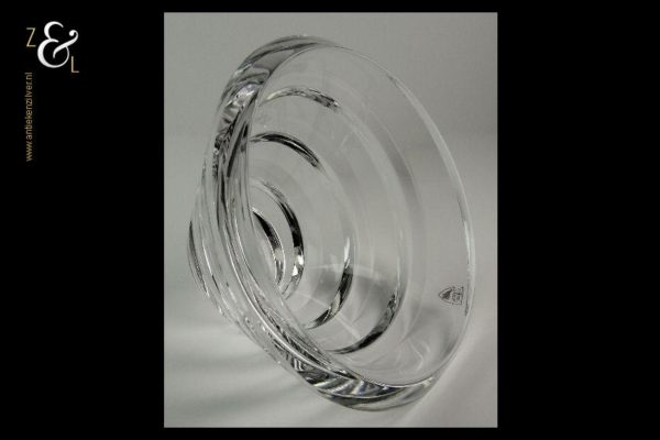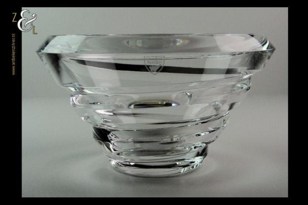 Deze in helder kristal uitgevoerde schaal is gemaakt in Zweden bij de glasblazerij Orrefors Crystal naar een ontwerp uit 2010 van Lena Bergström. De schaal model Swing is aan de onderzijde gesigneerd met Orrefors LB 65350-12. De schaal weegt 1253 gram heeft een diameter van 17.8 cm en is 10.1 cm hoog.