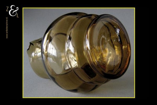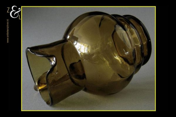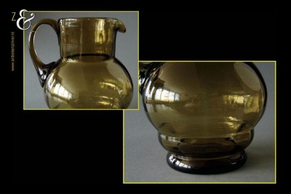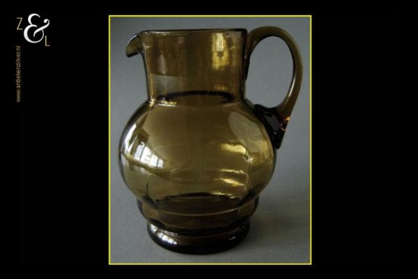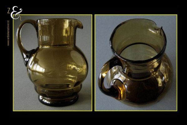 Deze antiekbruine glazen schenkkan / waterkan is gemaakt in Frankrijk en stamt uit het einde van de 19e en het begin van de 20e eeuw. De mondgeblazen schenkkan / waterkan heeft een inhoud van 1 liter weegt 675 gram is 17.3 cm hoog en heeft een diameter van 13 cm. De voet heeft een diameter van 9.3 cm.