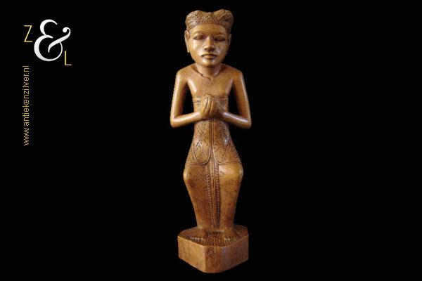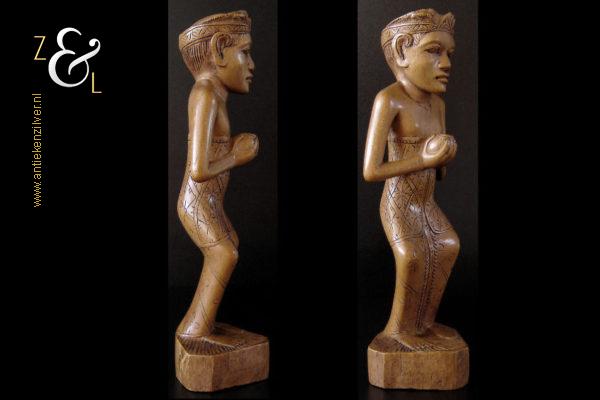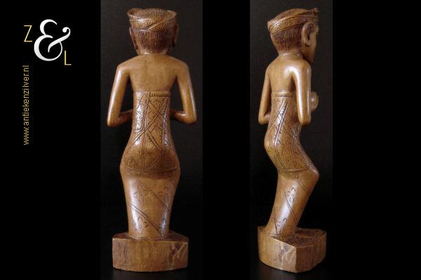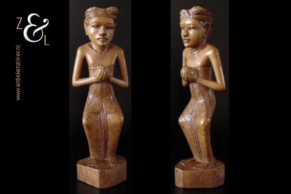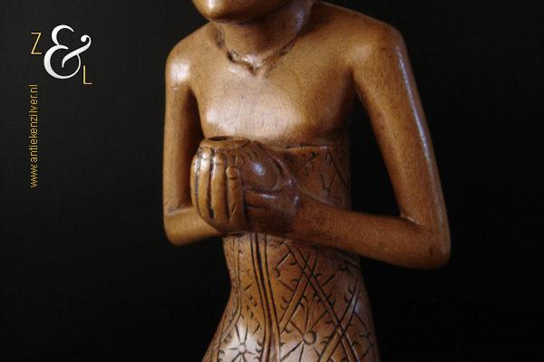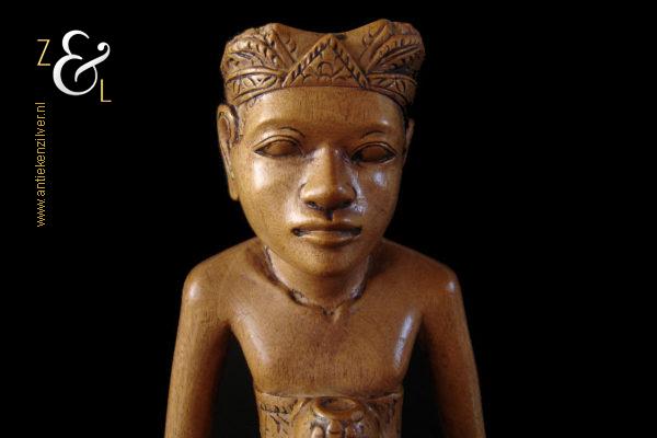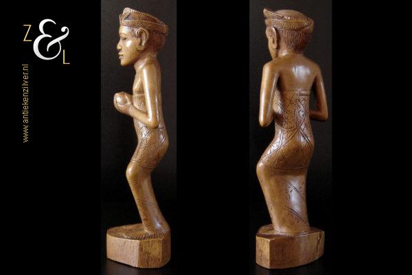 Houten sculptuur van vermoedelijk een Pedanda (Balinese priester) met een vogelei / watervat in zijn handen. Het op de hand gesneden houten sculptuur is omstreeks de jaren vijftig van de twintigste eeuw gemaakt op het eiland Bali – Indonesië is 28.5 cm hoog en weegt 265 gram. Het sculptuur heeft slijtageplekjes.