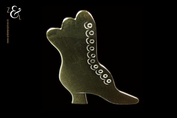 Deze in messing uitgevoerde “spill holder” in de vorm van een hooggeknoopte damesschoen is gemaakt in Engeland tijdens de tweede helft van de 19e eeuw de Victoriaanse periode die liep van 1837 tot 1901. De “spill holder” weegt 226 gram is 12.5 cm hoog 11 cm breed en 6.5 cm diep.