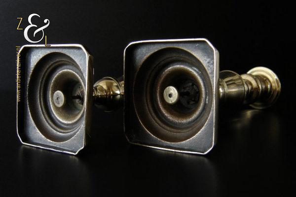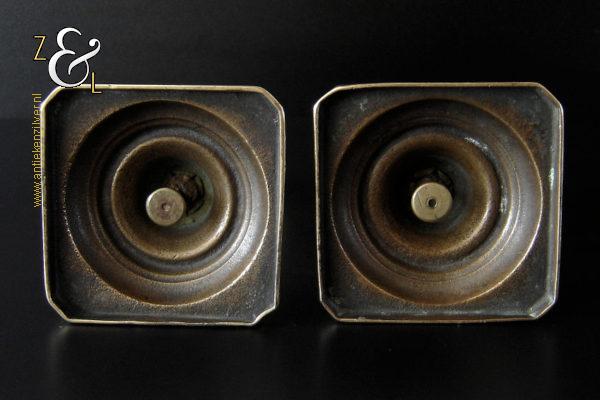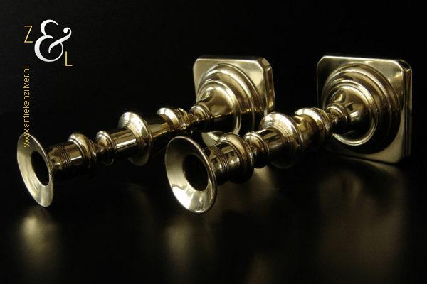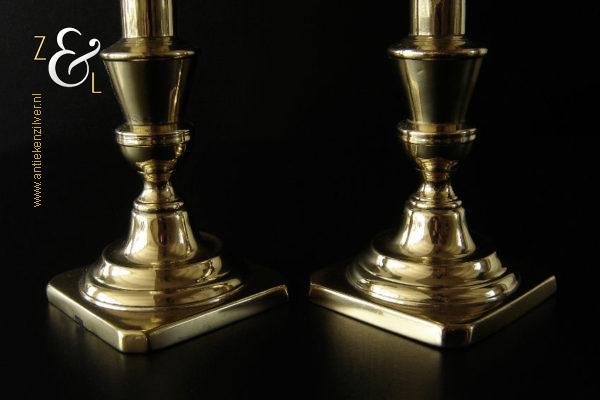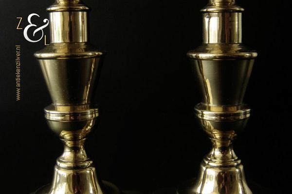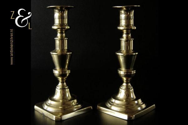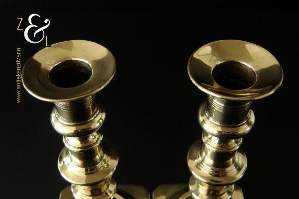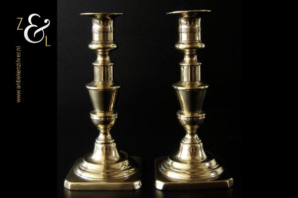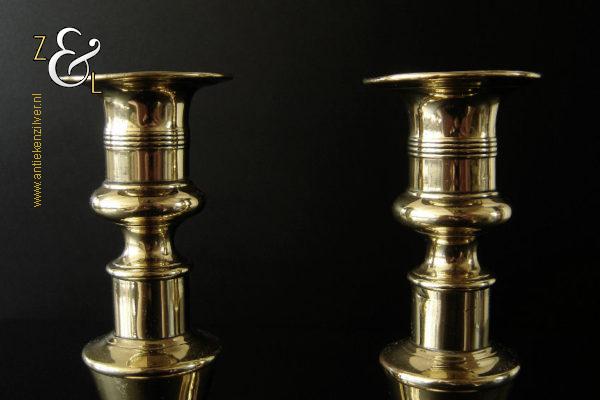 Dit stel messing kandelaars is gemaakt in Engeland tijdens de tweede helft van de 19e eeuw de Victoriaanse periode die liep van 1837 tot 1901. De kandelaars waarvan de balustervormige stelen zijn uitgevoerd in Art Deco stijl zijn 18.8 cm hoog hebben een vierkante voet met afgeschuinde hoeken van 8.6 cm bij 8.6 cm en wegen samen 782 gram. De kandelaars zijn geschikt voor kaarsen met een diameter van 2.2 cm en hebben een bobèche (kaarsvetopvanger) met een diameter van 4.9 cm. Tevens zijn de kandelaars voorzien van een zogenaamd “Push up ejection mechanism” (duwuitwerp-mechanisme) een patent van James Barlow sinds 1839, hiermee kan men na het branden van een kaars op een gemakkelijke wijze het overgebleven kaarsvet of de kaarsstomp verwijderen. James Barlow Brass Candlestick Maker te Birmingham was een fabrikant van diverse messing en koperen gebruiksartikelen.