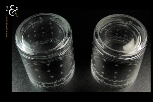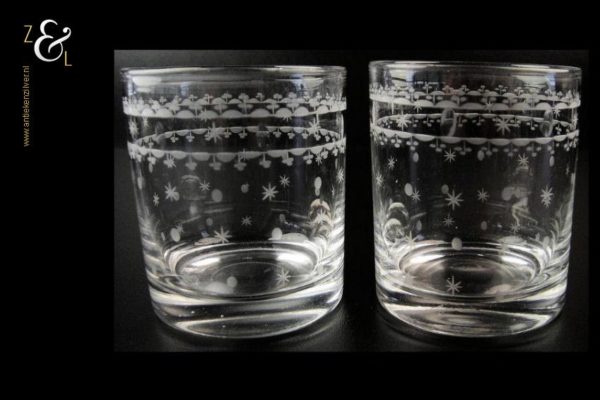 Dit stel Art Nouveau whiskey- whiskyglazen is gemaakt in de 19e eeuw door de kristal- en glasfabriek Vonêche in de Provincie Namen te België. De mondgeblazen en met sterren en stippen geëtste en geslepen glazen wegen samen 475 gram zijn 8.5 cm hoog en hebben een diameter van 7.2 cm.