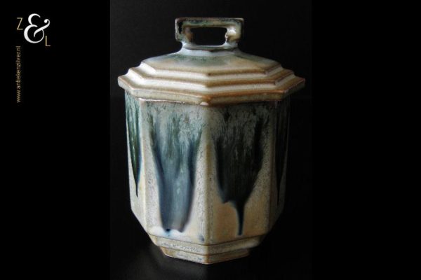 Deze achtkantige in Art Deco stijl gefabriceerde aardewerk suikerpot / snoeppot stamt vermoedelijk uit West Duitsland (zestiger jaren) en heeft aan de onderzijde het modelnummer 244. De blauwbeige geglazuurde suikerpot / snoeppot weegt 398 gram heeft een diameter van 10.2 cm en is 13 cm hoog.