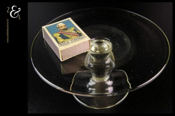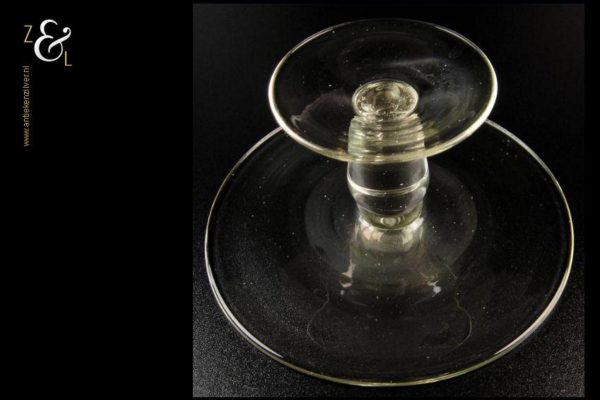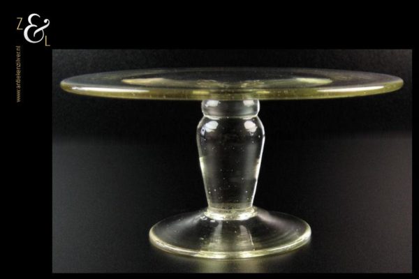 Dit mondgeblazen en geheel op de hand vervaardigde antieke glazen taartplateau is gemaakt in Nederland in de 19e eeuw. Het taartplateau dat uitgevoerd is in een champagnekleur, weegt 377 gram en is 8cm hoog het plateau heeft een diameter van 16.2 cm en de diameter van de voet meet 8.1 cm. Men kan op dit plateau bijvoorbeeld taartjes of andere lekkernijen zoals bonbons uitstallen. Aan de onderzijde van de voet zit een pontil merk.
