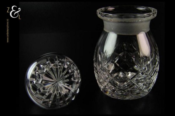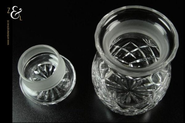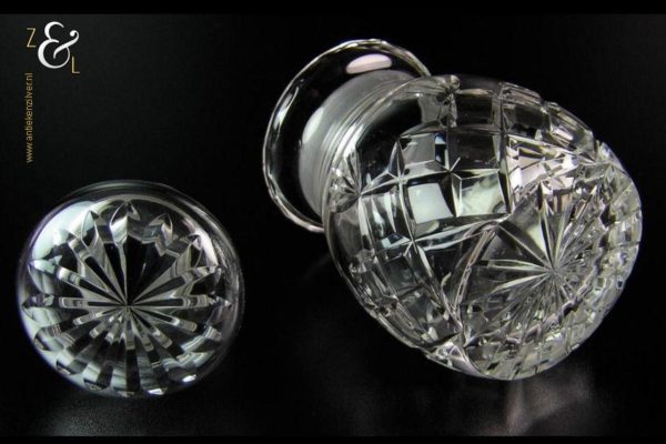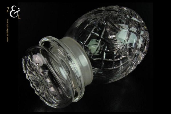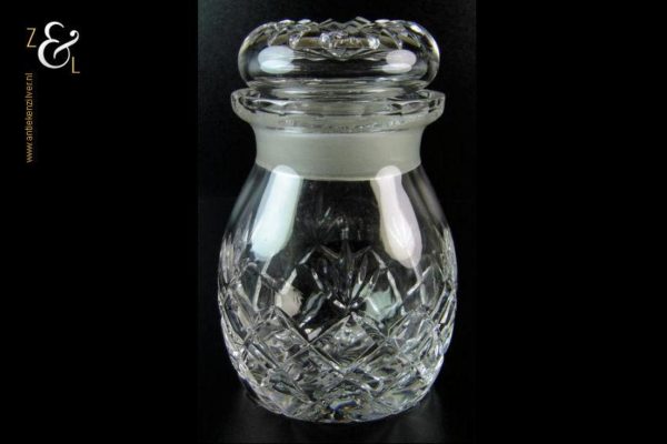 Deze in ruit en waaier geslepen kristallen theebus is uitgevoerd met een geslepen ster op de stop en aan de onderzijde. De theebus is 15 cm hoog heeft een diameter van 9 cm en weegt 800 gram.