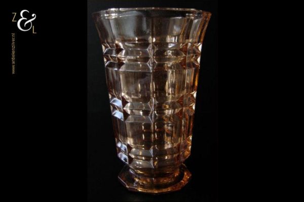 Deze mooie zware Art Deco vaas van roze persglas stamt uit Frankrijk waar hij rond 1930 gemaakt is. De vaas weegt 1363 gram is 20.5 cm hoog en heeft een diameter aan de bovenzijde van 13.2 cm en aan de onderzijde van 9 cm. Aan de onderzijde van de voet staat “made in France” en het nummer 4. De vaas heeft ingesloten luchtbelletjes die tijdens de productie ontstaan zijn.