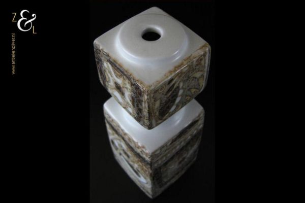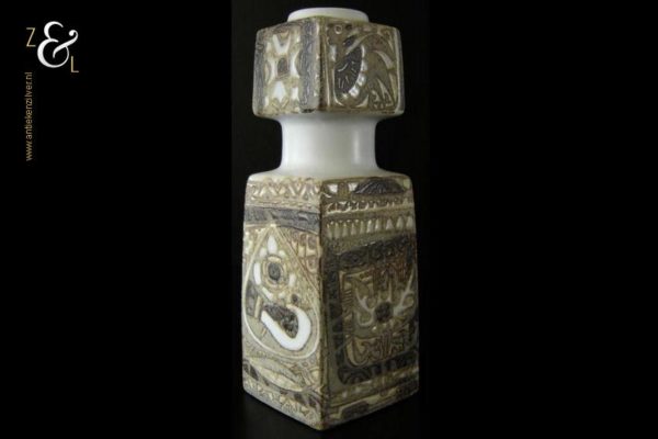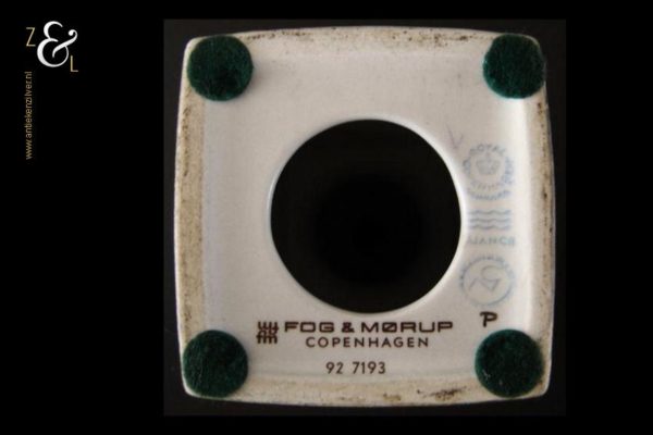 Deze vaas / lampvoet met vogel mozaïek afbeeldingen is gemaakt bij Royal Copenhagen te Denemarken, de fajance vaas die behoort tot de zogenaamde BACA serie is een klassieker die stamt uit de zeventiger jaren en is ontworpen door de beroemde Deense aardewerk en porselein ontwerper Nils Johan Thorvald Thorsson. Aan de onderzijde is de vaas gemerkt met Royal Copenhagen Denmark, Fajance, het decoratienummer 92/7193, FOG & MORUP (een firma die exclusieve design lampen verkocht) en in een cirkel de initialen van Nils Thorsson. De vaas weegt 503 gram is 20.2 cm hoog en heeft een lengte van 7 cm en is 7 cm breed.
