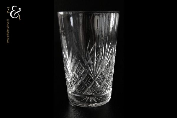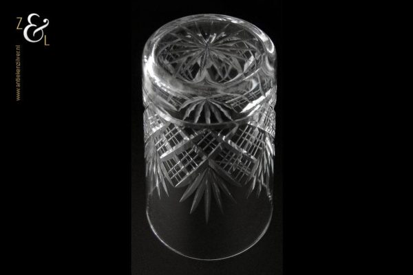 Dit kristallen whiskey- whiskyglas is in de eerste helft van de 20e eeuw (veertiger jaren) in Nederland gemaakt. Het mondgeblazen en in ruit en waaier handgeslepen en gepolijste glas weegt 99 gram is 10.1 cm hoog en heeft een diameter van 6.5 cm aan de onderzijde van dit glas is een ster geslepen.