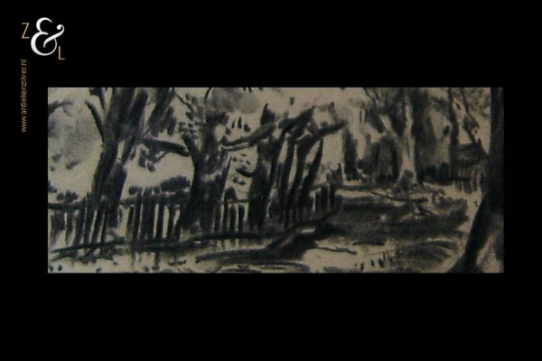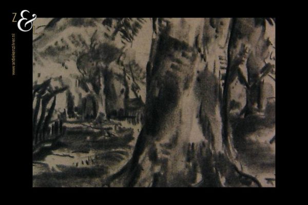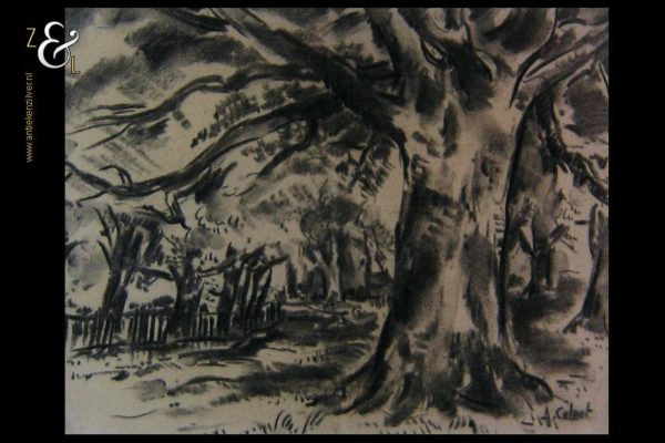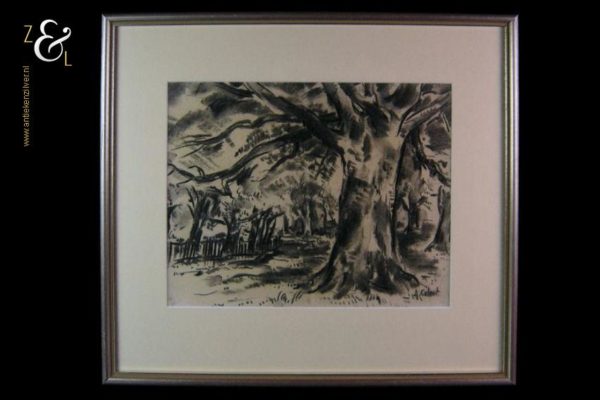 Deze mooie tekening van een boslandschap is gemaakt door Arnout Jacobus Gustaaf Colnot. De afmeting van de tekening is 29.5 cm bij 22.5 cm. De afmeting inclusief lijst is 43.7 cm bij 37.7 cm. De tekening heeft een mooie zilverkleurige houten lijst die door een professionele lijstenmaker is vervaardigd. Het werk is rechts onder met A. Colnot gesigneerd.