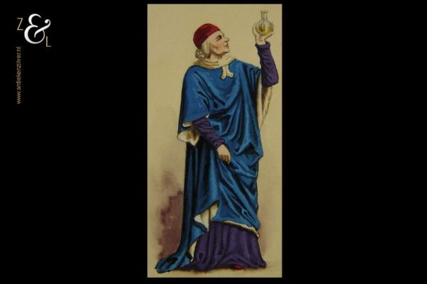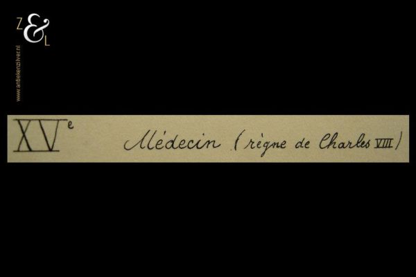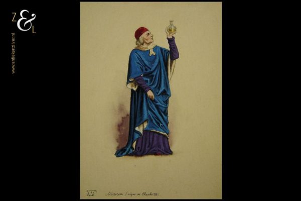 Aquarel op papier met de afbeelding van een dokter, een zogenaamde piskijker* uit de regeerperiode van koning Karel de VIII van Frankrijk. De afmetingen van deze aquarel is 24.9 cm bij 18.1 cm.