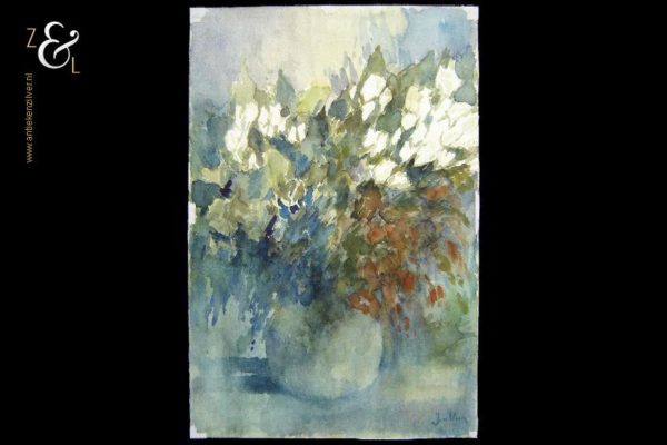 Deze aquarel met de afbeelding van een vaas met witte en rode bloemen is gemaakt door Jaap van Veen. De aquarel is rechtsonder met aquarelverf gesigneerd J.v.Veen en is 46 cm lang bij 31 cm breed.
