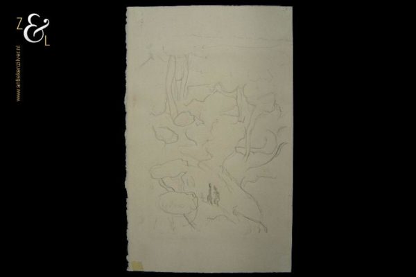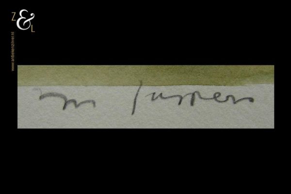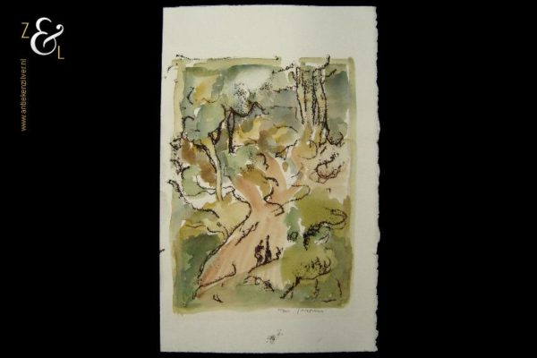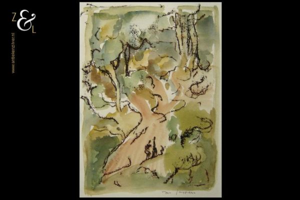 Deze aquarel gemaakt door Marjan Jaspers met de titel “Boslandschap met twee figuren” is aan de buitenzijde gemeten 40 cm lang bij 25 cm breed, de aquarel zelf is 28 cm lang bij 20 cm breed. De aquarel is in potlood rechtsonder gesigneerd M. Jaspers. Aan de achterzijde heeft Marjan Jaspers de voorstelling met potlood getekend. Door deze techniek toe te passen zijn de potloodlijnen aan de voorkant op het aquarel niet zichtbaar.