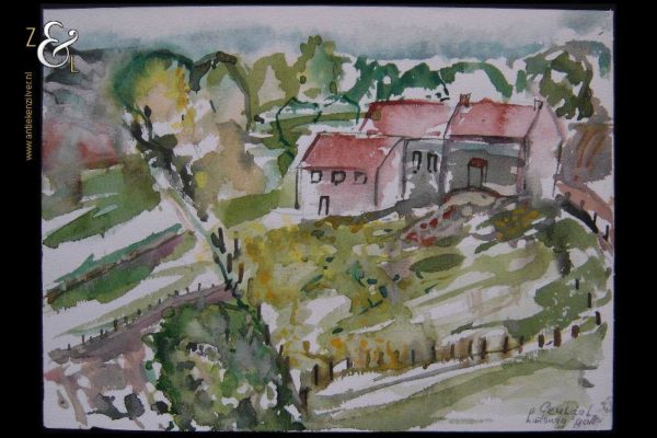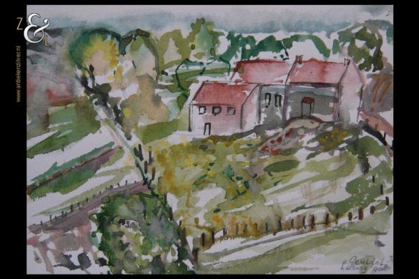 Deze aquarel is gemaakt door Monique Polak en meet 30.9 cm bij 22.7 cm. De aquarel is rechtsonder in potlood gesigneerd en gedateerd met haar initialen MP en Geuldal Limburg ’90.
