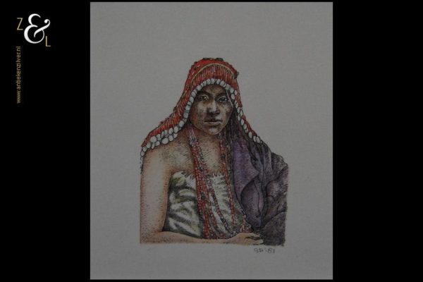 Deze aquarel / pentekening is gemaakt door Ger Daniëls en meet 9.7 cm bij 8.6 cm de buitenzijde van het dubbele passe partout meet 42 cm bij 31.5 cm. De miniatuur portrettekening is rechtsonder in potlood gesigneerd en gedateerd met initialen G.D. ’81.