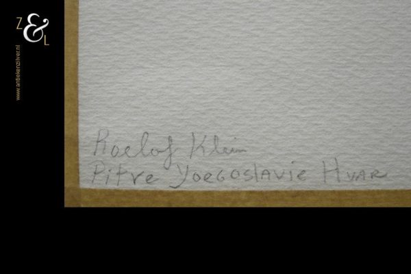 Deze aquarel met de afbeelding van een wit dorp in de bergen is gemaakt door Roelof Klein. Hij heeft deze aquarel op vakantie gemaakt in het plaatsje Pitve op het eiland Hvar Kroatië (voormalig Joegoslavië). De aquarel is aan de voorzijde linksonder met aquarelverf gesigneerd: Roelof Klein. Op de achterzijde staat linksonder in potlood : Roelof Klein Pitve Yoegoeslavie Hvar. De aquarel is 36 cm lang bij 30 cm breed.