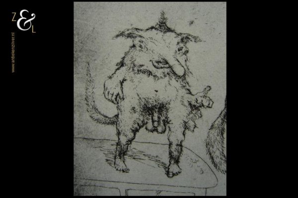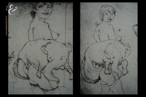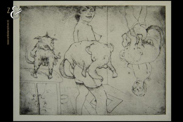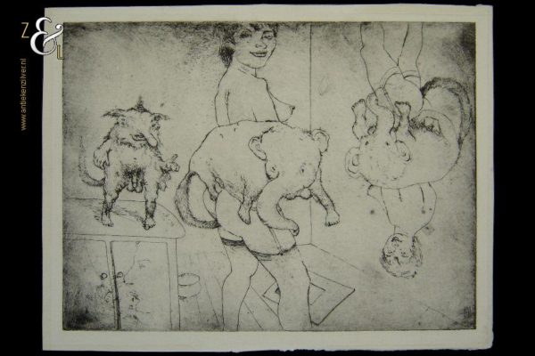 Deze ets met de afbeelding van groteske figuren / fantasiefiguren, naakte vrouwen en (zelf)portretten is gemaakt door een voor ons onbekende kunstenaar. De ets is aan de buitenzijde gemeten 36 cm lang bij 27.4 cm breed de maat van de voorstelling is 33 cm lang bij 24.5 cm breed.