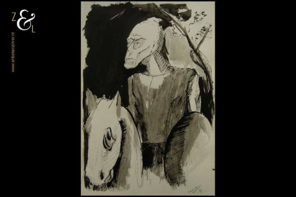 Deze gewassen inkttekening met de afbeelding van een ruiter op paard is gemaakt door een voor ons nog onbekende kunstenaar. De gewassen inkttekening die de sfeer weergeeft van een Japanse prent is rechtsonder in potlood gesigneerd en gedateerd: Lex van de… ’88. De gewassen inkttekening heeft aan de randen lijmresten van een door ons verwijderd niet zuurvrij passe partout. De gewassen inkttekening is 31 cm lang bij 21.6 cm breed.