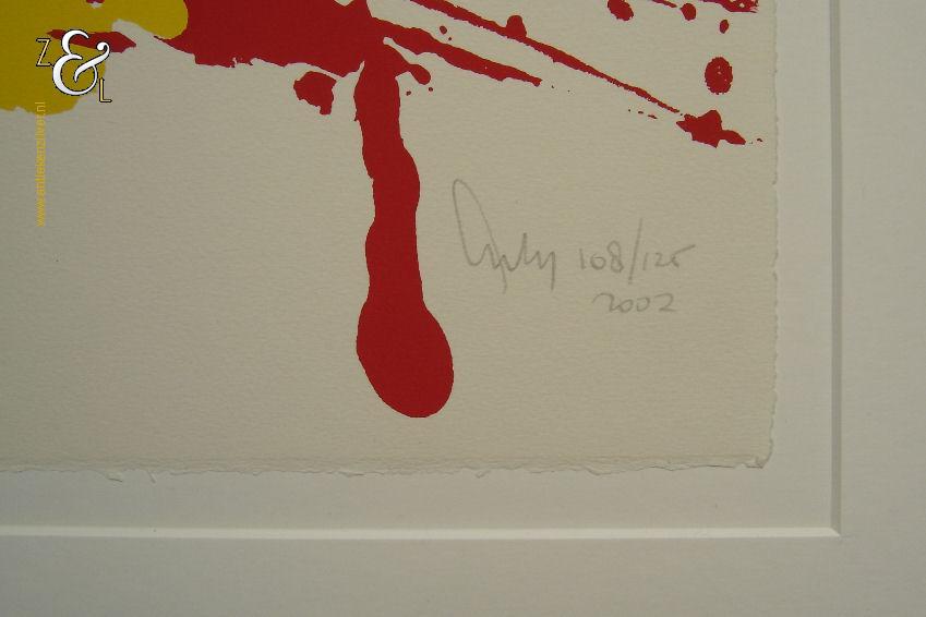 Deze zeefdruk is gemaakt door Arty Grimm. De zeefdruk is in potlood rechtsonder gesigneerd en gedateerd Arty 2002 en tevens staat hier de oplage 108/125. De zeefdruk is gemeten aan de binnenzijde van het passe partout 66 cm lang bij 50 cm breed. De buitenzijde van het passe partout is 89 cm lang bij 72 cm breed.