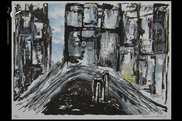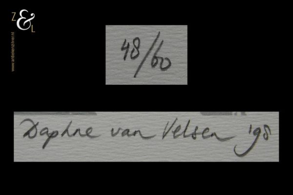 Deze zeefdruk van Daphne van Velsen is gemaakt in 1998 en meet 64 cm bij 45 cm. De zeefdruk is in potlood rechtsonder gesigneerd en gedateerd Daphne van Velsen ’98 en linksonder staat de oplage 48 / 60.