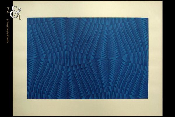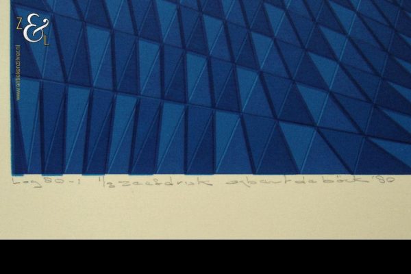 Deze zeefdruk in de geometrisch abstracte stijl is gemaakt door Egbert de Böck in 1980 en is 65 cm lang bij 50 cm breed. Deze zeefdruk is in potlood linksonder gesigneerd en gedateerd Egbert de Böck ’80 tevens staat hier de titel Log 80-1 en de oplage 1/3 zeefdruk.