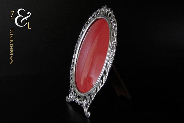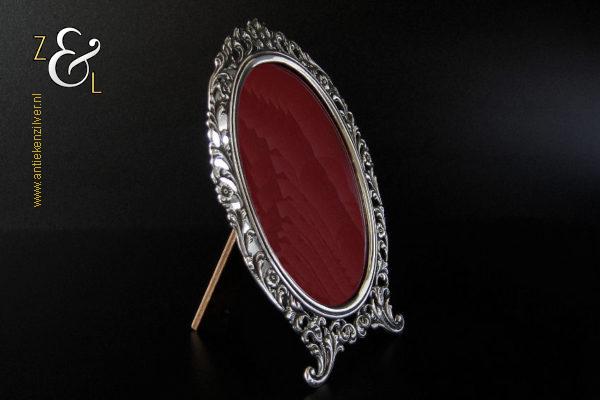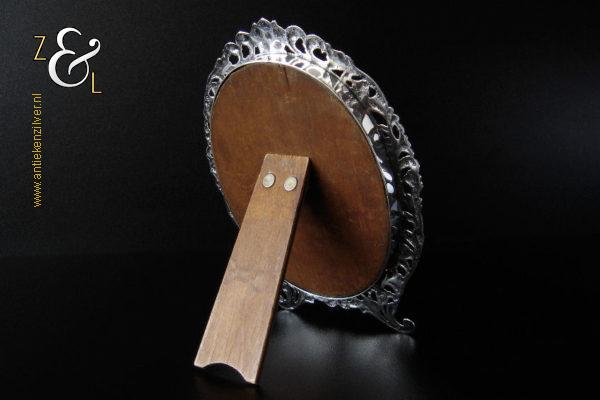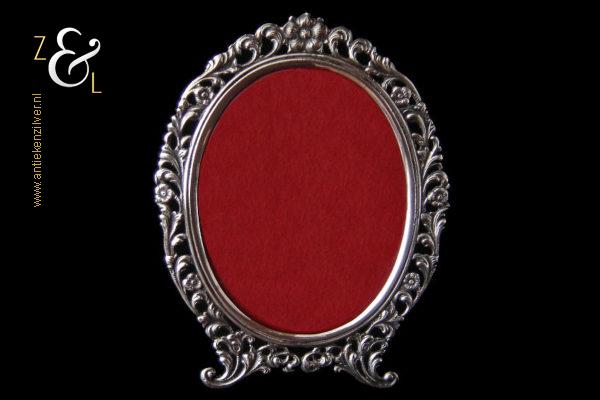 Deze fotolijst is gemaakt in Nederland en stamt uit de eerste helft van de 20e eeuw. De ajour gegoten verzilverde fotolijst weegt inclusief glas en achterkant 169 gram. De fotolijst is 16.2 cm lang bij 12.3 cm breed. De lijst is geschikt voor ovale foto’s van 11.4 cm bij 8.7 cm en heeft nog het originele bolle glas.