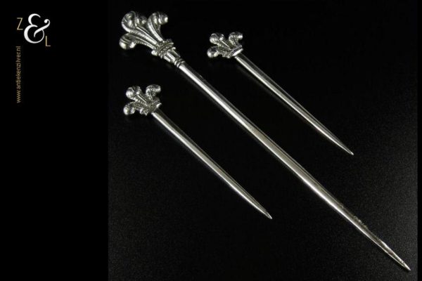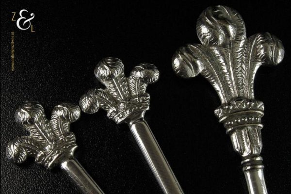 Deze set van een grote en twee kleine verzilverde vleespennen of spiesen zijn bekroond met de Prince of Wales Feathers. De vleespennen zijn eind 19e eeuw door Daniël & Arter zilversmeden en electroplaters te Birmingham Engeland gemaakt. De twee kleine vleespennen zijn gekeurd met D & A in achthoeken wat staat voor Daniël & Arter en een anker in een schild wat staat voor het Birmingham Assay Office, de grote vleespen is niet gekeurd. De vleespennen wegen samen 128 gram, de grote vleespen is 27.5 cm lang en de twee kleine vleespennen zijn 14 cm lang.
