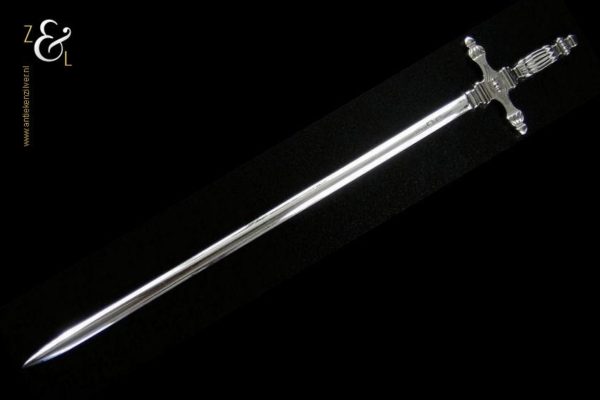 Deze verzilverde vleespen of spies is uitgevoerd in de vorm van een zwaard. De vleespen is eind 19e eeuw gemaakt in Frankrijk en gemerkt met een rechthoekig stempel met de inscriptie S.F.A.M. dit was een zilver en zilverpleet fabriek opgericht in 1894 te Chambly Noord Frankrijk. Het merk S.F.A.M. staat nu voor de Chambly zilver Company die in Parijs actief is. Tevens heeft de spies een rechthoekig stempel waarin staat Métal Alliange Blanc (als drie regels) dit is een merk dat aangeeft dat we met Frans zilverpleet te maken hebben en een rechthoekig stempel waarin twee handen (elkaar handen schuddend) met daaronder 12gr dit is een merk dat refereert naar de kwaliteit van hoe zwaar het stuk verzilverd is. De vleespen weegt 35 gram is 24 cm lang en het zwaard meet 4.1 cm bij 5 cm.