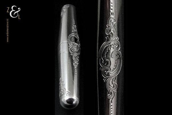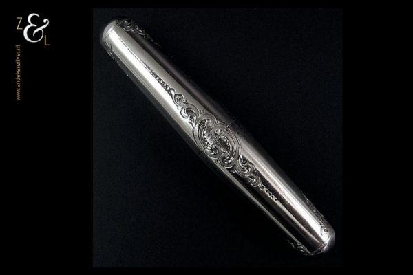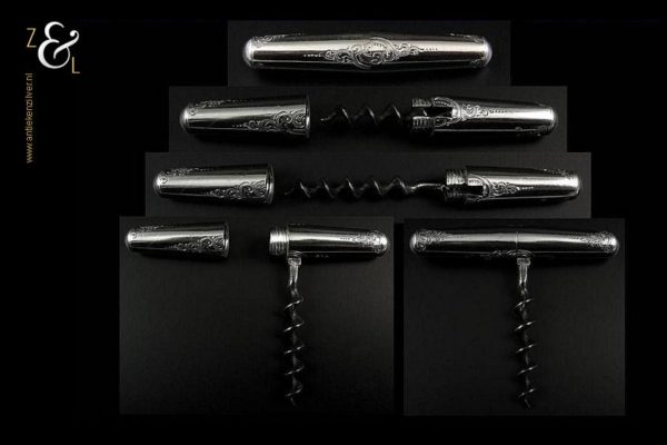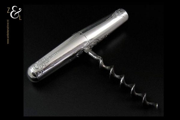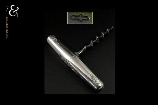 Deze kurkentrekker is gemaakt in Nederland vermoedelijk in Schoonhoven (vergelijkbare kurkentrekkers zijn daar ook gemaakt) rond 1860 gekeurd met een zwaardje (1814 – 1905). De mooie zilveren met c-vormige voluten gegraveerde opvouwbare kurkentrekker heeft een stalen trekker weegt 28 gram en is 7.9 cm lang.