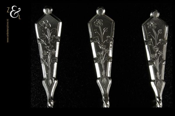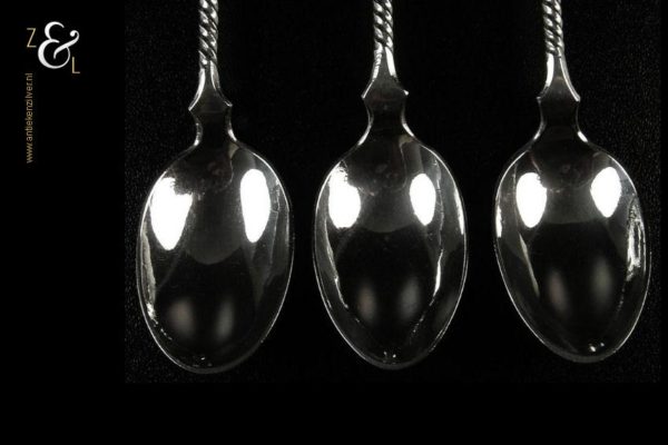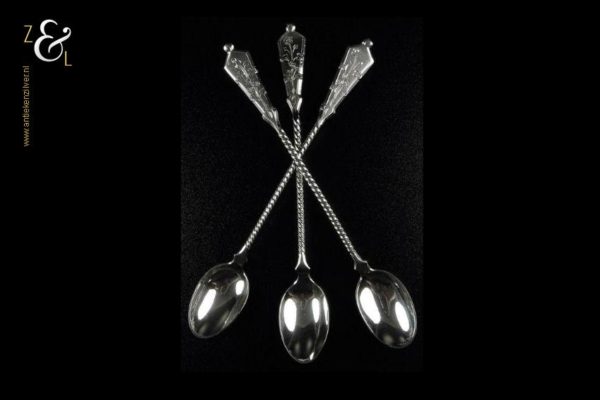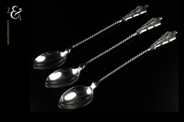 Deze 3 longdrinklepels zijn gemaakt in Woudsend / Sneek door Johannes Schijfsma Jz. (meesterteken JS boven 189 in vierkant) in het jaar 1901 (jaarletter R). De Art Deco lepels hebben getordeerde stelen met gematteerde handvatten die gegraveerd zijn met bloemtakken (matteren is een bewerking waarbij de zilversmid het oppervlak van een zilveren voorwerp een matte structuur geeft). De drie longdrinklepels wegen samen 56 gram en zijn 17.4 cm lang. De zilveren longdrinklepels zijn ook goed te gebruiken als koffie- of theelepel in een mok of als Cocktail-, Sorbet- of IJslepel.