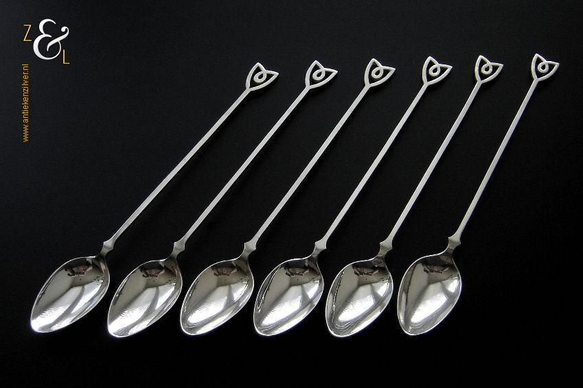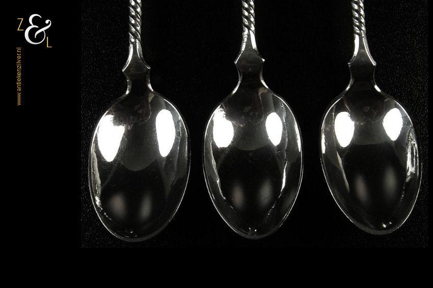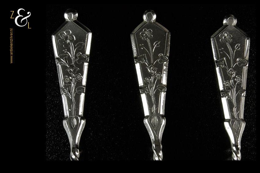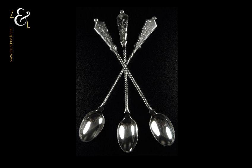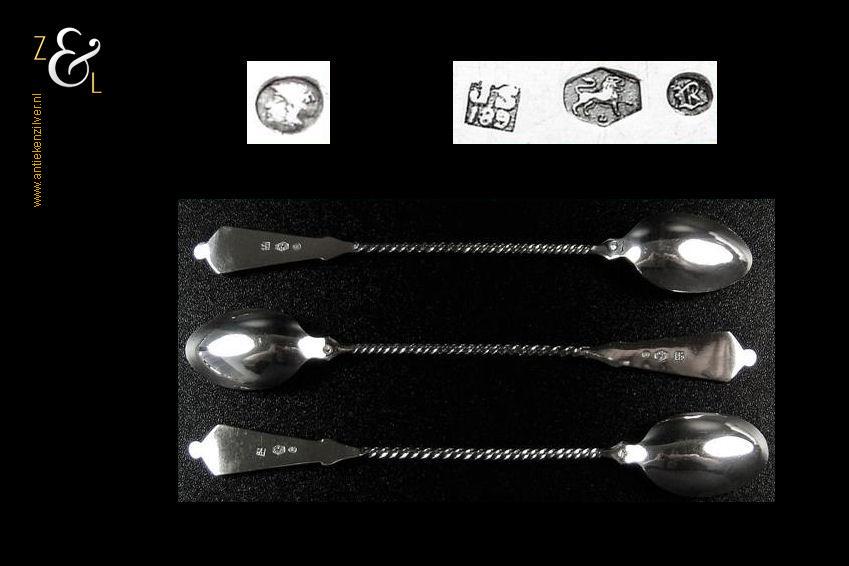 Deze 3 longdrinklepels zijn gemaakt in Woudsend / Sneek door Johannes Schijfsma (meesterteken JS boven 189 in vierkant) in het jaar 1901 (jaarletter R). De in Art Deco stijl uitgevoerde longdrinklepels hebben getordeerde stelen met gematteerde handvatten die gegraveerd zijn met bloemtakken (matteren is een bewerking waarbij de zilversmid het oppervlak van een zilveren voorwerp een matte structuur geeft). De drie longdrinklepels wegen samen 56 gram en zijn 17.4 cm lang. De zilveren longdrinklepels zijn ook goed te gebruiken als koffie- of theelepel in een mok of als Cocktail-, Sorbet- of IJslepel.