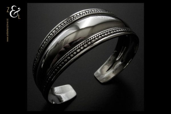 Deze massief zilveren armband is in het buitenland gemaakt (vermoedelijk Engeland) en stamt uit de zeventiger jaren. De armband is gekeurd met het zilverkeur 925 voor eerste gehalte (Sterling) zilver heeft een diameter van 6 cm is 2.3 cm breed en weegt 27 gram.