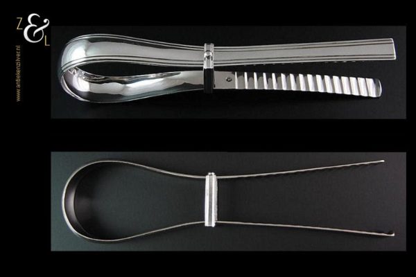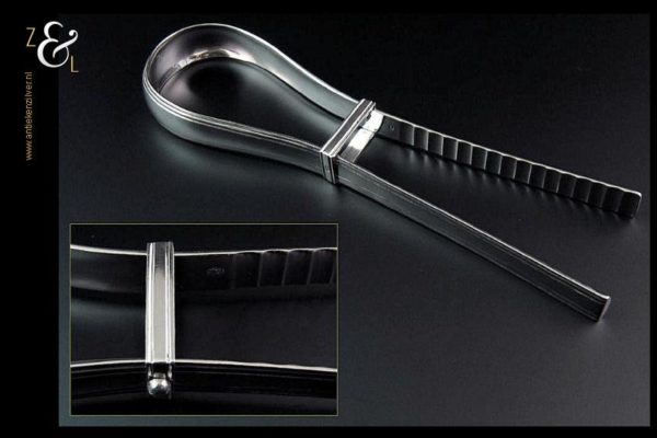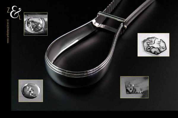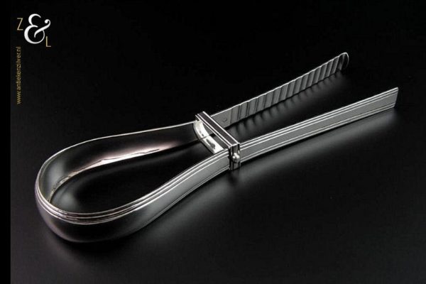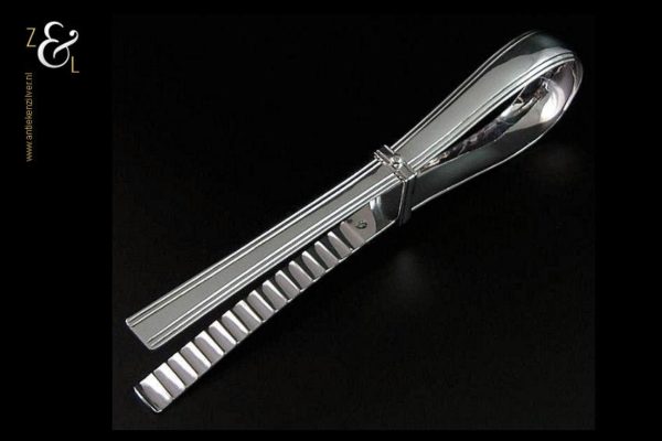 Aspergetang gemaakt in Voorschoten door de Firma J.M. van Kempen & Zonen (meesterteken liggend maantje tussen punten boven VK in vierkant) in het jaar 1884 (jaarletter Z). Deze slanke zilveren aspergetang is uitgevoerd met een filetrand, weegt 101 gram en is 22.4 cm lang.