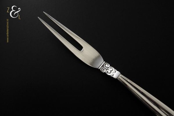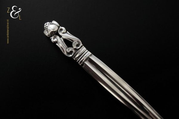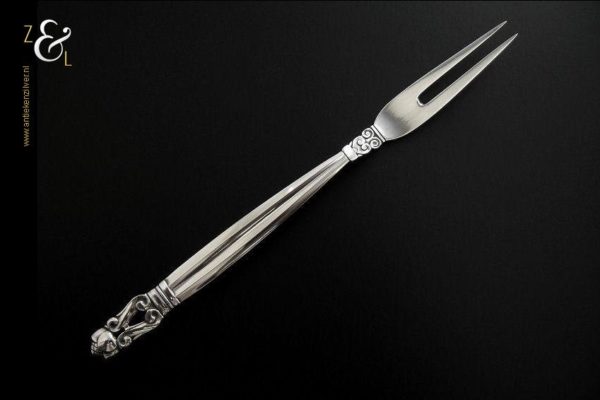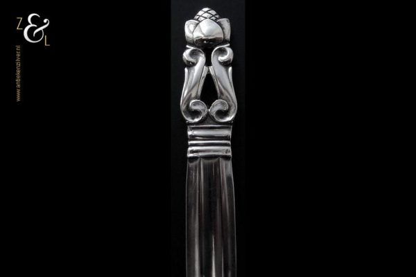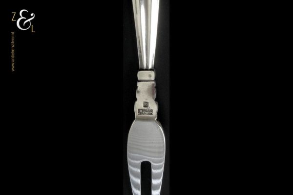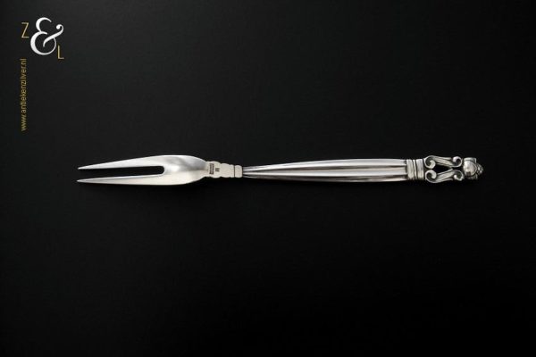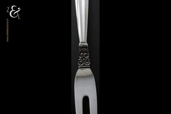 Deze belegvork / zuurvork (uitgevoerd in het Acorn model ontworpen door Johan Rohde in 1915) is gemaakt in Kopenhagen Denemarken bij de wereldberoemde zilversmederij van Georg Jensen (meesterteken G in J in rechthoek) dit meesterteken was in gebruik van 1933 tot 1944. Tevens is deze belegvork / zuurvork gekeurd met STERLING DENMARK een aanduiding voor eerste gehalte zilver. Deze mooie zilveren belegvork / zuurvork is 16.6 cm lang en weegt 25 gram.